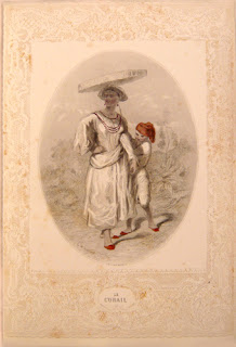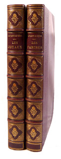GAVARNI et J. MERY. Perles et Parures, Les Joyaux, fantaisie par Gavarni, texte par Méry. Minéralogie des dames par le Cte Fœlix. - suivi de: Les Parures, fantaisie par Gavarni, texte par Méry. Histoire de la mode par le Cte Fœlix. Paris, G. de Gonet, Martinon, Vve L. Janet, à Leipzig, chez Ch. Twietmeyer, (1850), 2 vol. gd in 8°, de 300pp. & 316pp., avec un frontispice répété et 30 ravissantes planches gravées sur acier par Geoffroy h. t. d'après Gavarni le tout finement aquarellé, augmenté d'un second état des planches en noir, demi-maroquin brun à coins, dos orné et mosaïqué d'une rose claire, t. dorée, couv. ill. et dos cons., ainsi que le prospectus de souscription de 4pp. sur papier bleu pour chaque volume, (V. Champs). Exceptionnel exemplaire de tête dans le tirage de luxe sur papier vélin et avec deux états des planches, un état  aquarellé tiré dans de beaux encadrements gaufrés et découpés en dentelle, et un état en noir tiré sur chine collé, qq. infimes rousseurs dans les marges des dentelles sinon très bel exemplaire à toutes marges finement relié avec les couvertures et le prospectus.